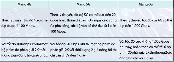 Bảng 1. So sánh tốc độ giữa mạng 4G, 5G và 6G