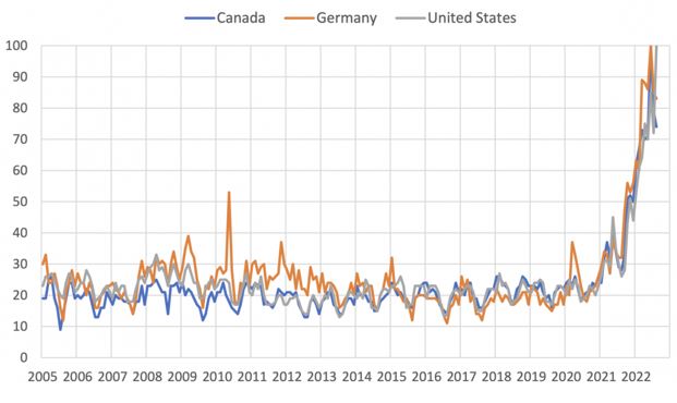 Biểu đồ báo cáo số lượng tìm kiếm trên Google cho cụm từ "lạm phát", bắt nguồn từ các quốc gia khác nhau. Dữ liệu cho mỗi quốc gia được chuẩn hóa theo biên độ từ 0 đến 100. Thời gian lấy mẫu từ tháng 01/2005 đến tháng 8/2022.