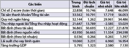Trong đó i và t tương ứng là các ngân hàng và các năm. RuiRoi,t là biến phụ thuộc, xác định bằng thang đo rủi ro mất khả năng thanh toán (rủi ro vỡ nợ). Mô hình bảng động được sử dụng khi mà rủi ro ngân hàng luôn tồn tại và được thúc đẩy bởi hành vi chấp nhận rủi ro của năm trước. Uncertaintyt-1 là phép đo về sự bất định của ngân hàng, được nắm bắt bằng sự phân tán của các cú sốc ngân hàng. Kiemsoatnoitaiii,t-1 chứa các biến cấp ngân hàng kiểm soát quy mô ngân hàng (logarit tự nhiên của tổng tài sản ngân hàng), khả năng thanh khoản (tỷ lệ tài sản lưu động trên tổng tài sản) và mô hình kinh doanh (tỷ lệ giữa thu nhập ngoài lãi trên tổng thu nhập hoạt động). Kiemsoatnoitaiii,t-1 là một tập hợp các phép đo kiểm soát kinh tế vĩ mô, bao gồm tăng trưởng kinh tế (tốc độ tăng tổng sản phẩm quốc nội) và chính sách tiền tệ (lãi suất cho vay ngắn hạn). Các biện pháp kiểm soát này là những yếu tố chính có thể giải thích rủi ro của các ngân hàng, phù hợp với các tài liệu về ngân hàng. εi,t là thành phần sai số. Để giảm bớt các vấn đề về quan hệ nhân quả ngược, nghiên cứu lấy tất cả các biến độc lập với độ trễ một năm. Bảng 1 trình bày thống kê mô tả các biến.