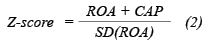 Trong đó ROA và SD(ROA) là tỷ suất lợi nhuận ròng trên tài sản bình quân và độ lệch chuẩn của tỷ lệ lợi nhuận này, và CAP là tỷ lệ vốn chủ sở hữu trên tổng tài sản. Độ lệch chuẩn của ROA trong toàn thời gian nghiên cứu sẽ được sử dụng. Chỉ số này càng cao thì rủi ro ngân hàng mất khả năng thanh toán càng thấp.