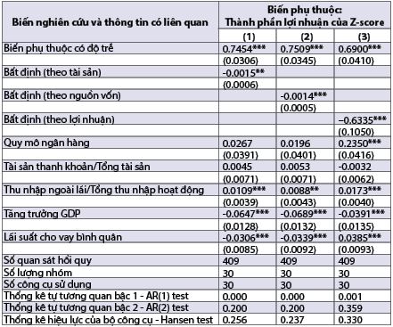 Bảng 2 trình bày kết quả về quan hệ giữa bất định ngân hàng và rủi ro vỡ nợ thông qua chỉ số Z-score. Có thể thấy rằng, các hệ số ước lượng về bất định ngân hàng (cụ thể trong hồi quy bất định ngân hàng theo lợi nhuận) là âm và có ý nghĩa thống kê, cho thấy mối liên hệ tiêu cực giữa sự bất định ngân hàng và chỉ số Z-score về sự ổn định của ngân hàng. Khi chỉ số Z-score cao hơn cho thấy rủi ro mất khả năng thanh toán đối với các ngân hàng thấp hơn, các ước lượng hệ số âm được hiểu là sự suy giảm tính ổn định của ngân hàng, hay nói cách khác là sự gia tăng rủi ro mất khả năng thanh toán của ngân hàng với sự gia tăng của bất định.