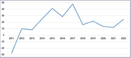 Hình 1: Tăng trưởng dư nợ tín dụng BĐS giai đoạn 2011 - 2022 (%)