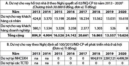 Đối với việc thực hiện cho vay nhà ở xã hội theo Nghị định số 100/2015/NĐ-CP chủ yếu thực hiện thông qua Ngân hàng Chính sách xã hội (NHCSXH). Kết quả, trong giai đoạn 2018 - 2020, dư nợ cho vay phát triển nhà ở xã hội tại NHCSXH tăng từ hơn 904 tỉ đồng trong năm 2018 lên hơn 4.499 tỉ đồng trong năm 2020. (Bảng 1)
