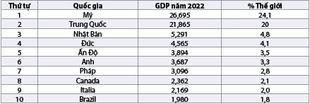 Bảng 1: Top 10 nền kinh tế lớn nhất thế giới năm 2022