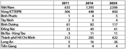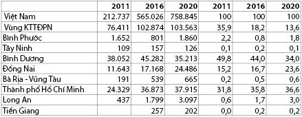 Năm 2020, Thành phố Hồ Chí Minh có số lượng doanh nghiệp ngành điện tử dẫn đầu toàn vùng KTTĐPN với 73% số lượng doanh nghiệp điện tử; các địa phương khác của vùng KTTĐPN thu hút đầu tư rất thấp trong ngành điện tử. (Bảng 1)