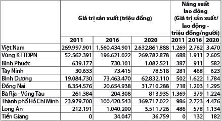 Trong cơ cấu giá trị sản xuất công nghiệp điện tử cả nước, vùng KTTĐPN đóng góp về giá trị sản xuất của ngành có xu hướng giảm dần qua các năm, từ 19,5% năm 2011 xuống còn 10,2% năm 2020. Đồng thời, tương quan giữa tỉ trọng doanh nghiệp và tỉ trọng giá trị sản xuất của doanh nghiệp điện tử vùng KTTĐPN trong cùng ngành đối với cả nước cho thấy, mặc dù Vùng chiếm tỉ trọng lớn về số lượng doanh nghiệp của ngành điện tử cả nước nhưng đóng góp về giá trị sản xuất của ngành đối với cả nước chưa tương xứng. Năm 2011, vùng KTTĐPN chiếm 48,2% số doanh nghiệp điện tử cả nước, nhưng đóng góp về giá trị sản xuất của ngành điện tử của vùng KTTĐPN đối với cả nước chỉ đạt 19,5%, đến năm 2020, tỉ lệ tương ứng là 33,9% và 10,2%. Tương quan giữa đóng góp về giá trị sản xuất và phân bổ doanh nghiệp vùng KTTĐPN, Thành phố Hồ Chí Minh, Bình Dương, Đồng Nai dẫn đầu về số lượng doanh nghiệp và đóng góp về giá trị sản xuất ngành điện tử. Tỉ trọng đóng góp của 03 tỉnh, thành này chiếm gần 98% giá trị sản xuất của ngành điện tử toàn Vùng giai đoạn 2011 - 2020; Long An đóng góp 1%; các địa phương khác là Bình Phước, Tiền Giang, Tây Ninh, Bà Rịa - Vũng Tàu đóng góp 1% giá trị sản xuất của ngành.