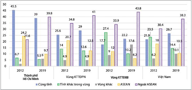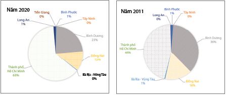 Thành phố Hồ Chí Minh đóng góp trong giá trị sản xuất của ngành điện tử toàn vùng KTTĐPN gia tăng mạnh từ 46% năm 2011 lên 63% năm 2020, Bình Dương sụt giảm từ 36% xuống còn 23% trong cùng giai đoạn. Như vậy, tác động lan tỏa của công nghiệp điện tử đối với các địa phương khác trong vùng KTTĐPN chậm so với các nhóm ngành khác. (Hình 1)
