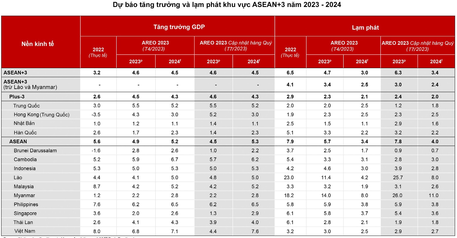 Dự báo của AMRO đối với tăng trưởng 2023 – 2024 của các nền kinh tế ASEAN+3 phần lớn không thay đổi so với các dự báo trong AREO hồi tháng 4/2023. Khu vực ASEAN+3 vẫn được dự đoán sẽ tăng trưởng 4,6% vào năm 2023. Tăng trưởng cho các nền kinh tế Plus-3 được dự báo tăng nhẹ lên 4,6% từ 4,5% trong AREO 2023, phản ánh nhu cầu nội địa và du lịch nội địa mạnh mẽ hơn ở Hồng Kông (Trung Quốc) và Nhật Bản. Đồng thời, dự báo tăng trưởng của ASEAN đã được điều chỉnh giảm xuống 4,5% từ mức 4,9% trong dự báo trước đó, phản ánh tác động của nhu cầu bên ngoài yếu hơn đối với Singapore và Việt Nam.