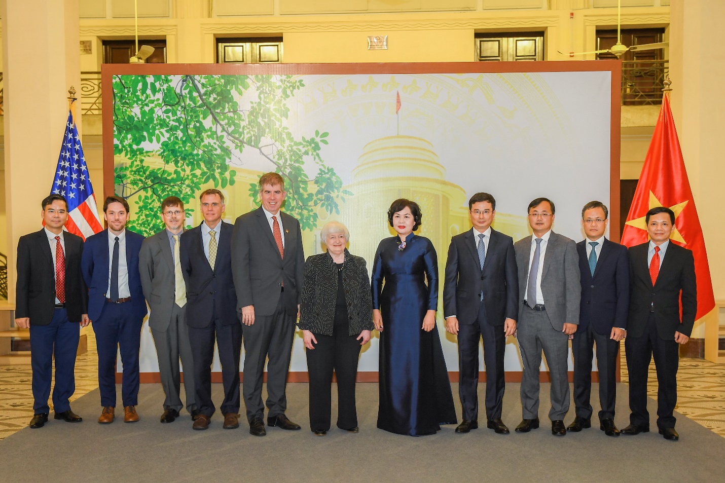 Hà Nội - ngày 20/7/2023, Thống đốc Ngân hàng Nhà nước Việt Nam Nguyễn Thị Hồng và Bộ trưởng Tài chính Hoa Kỳ Janet L. Yellen đưa ra Tuyên bố chung sau buổi làm việc trong khuôn khổ chuyến thăm của Bộ trưởng Yellen tại Hà Nội.