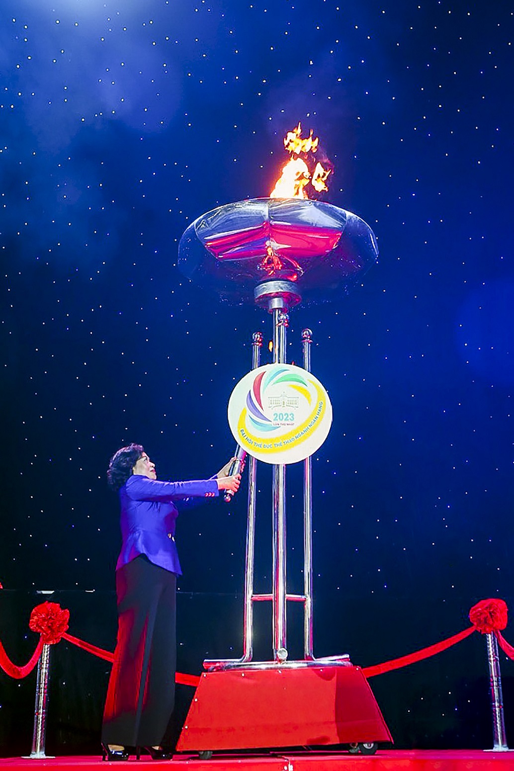 Thống đốc Nguyễn Thị Hồng thực hiện nghi thức thắp sáng đài lửa Đại hội Thể dục thể thao ngành Ngân hàng lần thứ nhất, năm 2023