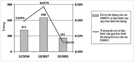 Hệ quả của những trở ngại nói trên là kể từ khi bắt đầu triển khai hoạt động của các quỹ bảo lãnh tín dụng (năm 2002), số vốn mà các DNNVV có thể vay từ các ngân hàng thông qua hoạt động bảo lãnh của các quỹ này là không nhiều, thêm vào đó lại đang có xu hướng giảm dần trong những năm gần đây. Thống kê của NHNN cho thấy, trong giai đoạn 2002 - 2017, số vốn mà các DNNVV có thể vay được từ các ngân hàng theo chứng thư bảo lãnh của các quỹ bảo lãnh tín dụng chỉ đạt khoảng 4.100 tỉ đồng. Tại thời điểm cuối năm 2016, dư nợ tín dụng có bảo lãnh của các quỹ bảo lãnh tín dụng là 411 tỉ đồng, chiếm tỉ trọng khoảng 0,039% trong số hơn 1,115 triệu tỉ đồng dư nợ của các DNNVV tại các ngân hàng. Đến hết năm 2017, dư nợ được bảo lãnh của DNNVV tăng lên 648 tỉ đồng, chiếm tỉ trọng khoảng 0,057% trong tổng số dư nợ của các DNNVV tại các ngân hàng. Tuy nhiên, con số này sau đó liên tục giảm dần qua các năm 2018 - 2022 và đến hết tháng 02/2023, dư nợ có bảo lãnh của quỹ bảo lãnh tín dụng chỉ còn lại 261 tỉ đồng, chiếm khoảng 0,012% trong gần 2,2 triệu tỉ đồng dư nợ của các DNNVV tại các ngân hàng cùng thời điểm (Hình 1).