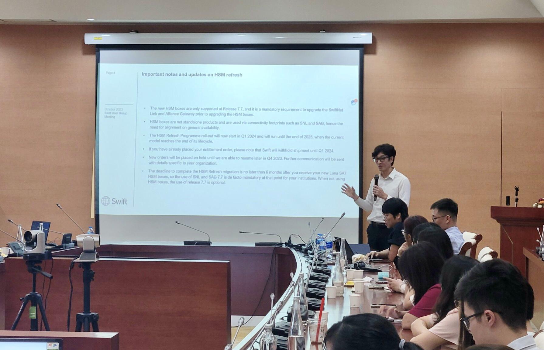 Cũng tại Hội nghị, chuyên gia SWIFT đã cập nhật các thay đổi, yêu cầu của SWIFT đối với chương trình An ninh khách hàng CSP, RMA Portal Migration, ISO 20022 Swift Translation, Alliance Release Timeline, nâng cấp hệ thống Swift lên phiên bản 7.7, thay thế HSM Box, đồng thời giới thiệu ứng dụng, giải pháp mới do SWIFT phát triển nhằm giúp các thành viên SWIFT gia tăng tiện ích, tăng cường bảo mật và thuận tiện trong thanh toán quốc tế như SWIFT Essentials, APIs, Alliance Cloud.