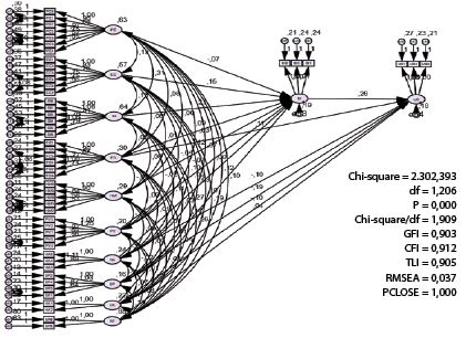Phương pháp phân tích SEM thông qua phần mềm AMOS được sử dụng để kiểm tra sự phù hợp của mô hình nghiên cứu. Kết quả ước lượng của mô hình đề xuất được thể hiện trong Hình 2. Các chỉ số bao gồm: Chi-square = 2.302,393; df = 1206; p = 0,000; Chi-bình phương/df = 1,909; CFI = 0,912; TLI = 0,905; GFI = 0,903; RMSEA = 0,037; PCLOSE = 1.000. Do đó, mô hình nghiên cứu đề xuất đạt được sự tương thích với dữ liệu thị trường.