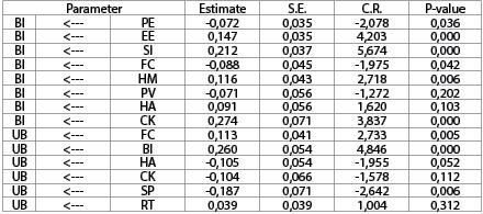 Trong sáu biến có ảnh hưởng đến BI lần lượt có bốn biến ảnh hưởng tích cực đến BI như: EE, SI, HM và CK, có hai biến tác động tiêu cực đến BI đó là biến PE và FC. Trong ba biến ảnh hưởng đến biến UB thì có hai biến ảnh hưởng tích cực đến biến UB theo thứ tự giảm dần là BI và FC, có một biến ảnh hưởng tiêu cực đến biến UB là biến SP như trong Bảng 9.
