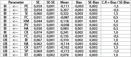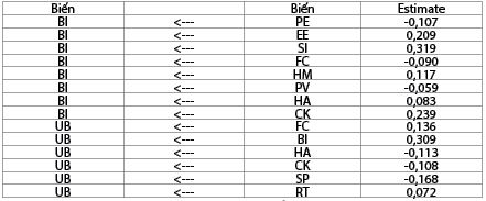 Sử dụng tiêu chuẩn tin cậy 95% (Sig. < 0,05), dấu hiệu về mối quan hệ của biến PV đối với biến BI là 0,202 > 0,05, biến PV không ảnh hưởng đến biến BI; dấu hiệu về mối quan hệ của biến HA đối với biến BI là 0,103 > 0,05, biến HA không ảnh hưởng đến biến BI; dấu hiệu về mối quan hệ của biến HA đối với biến UB là 0,052 > 0,05, biến HA không ảnh hưởng đến biến UB; dấu hiệu về mối quan hệ của biến CK đối với biến UB là 0,113 > 0,05, biến HA không ảnh hưởng đến biến UB; dấu hiệu về mối quan hệ của biến RT đối với biến UB là 0,312 > 0,05, biến RT không có ảnh hưởng đến biến UB. Các biến còn lại đều có Sig. < 0,05 nên các mối quan hệ này có ý nghĩa, kết quả trong Bảng 8.