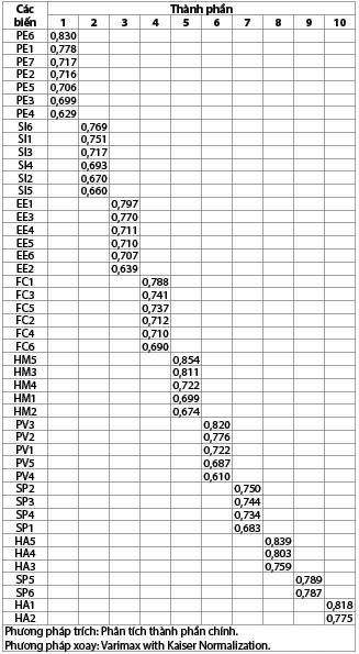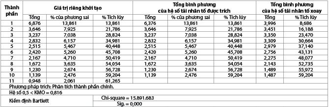 Phân tích EFA cho các biến độc lập với số lượng quan sát = 715; Phương pháp trích: Phân tích thành phần chính. Kết quả cho thấy, có 10 yếu tố được giữ lại (vì giá trị Eigenvalue > 1) (Bảng 4, 5).