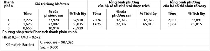 Kết quả phân tích EFA cho các biến phụ thuộc; Hệ số KMO đạt 0,672 lớn hơn 0,5, kết quả của kiểm định Bartlett là 907,026 và có ý nghĩa thống kê (Sig. < 0,05). Như vậy, giả thuyết ma trận tương quan giữa các biến là ma trận đồng nhất bị bác bỏ, các biến có tương quan với nhau và thỏa mãn điều kiện phân tích nhân tố.