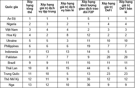 Bảng 1: Bảng xếp hạng Chỉ số top 13 nước chấp nhận tiền mã hóa toàn cầu 2023