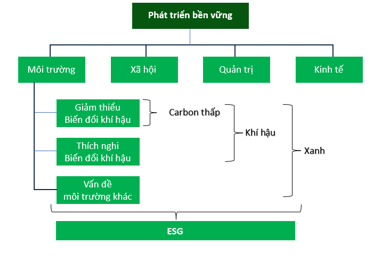 - Phát triển bền vững là khái niệm bao trùm nhất, gồm 04 trụ cột là môi trường (E), xã hội (S), quản trị (G) và kinh tế (E). Điều này phù hợp với quan điểm của Ủy ban Môi trường và Phát triển Thế giới (WCED, 1998):