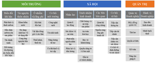 Các vấn đề về ESG có thể bao gồm: