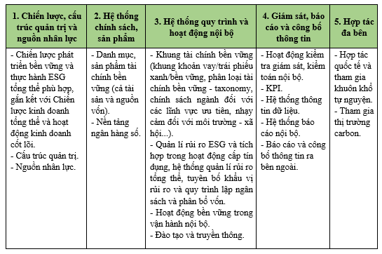 Qua rà soát, chưa có một hướng dẫn thống nhất nào trên toàn thế giới về việc thiết lập, triển khai ngân hàng bền vững, thực hành ESG. Trên cơ sở nghiên cứu, tổng hợp 03 hướng dẫn điển hình gồm: (i) Hướng dẫn về ngân hàng bền vững của IFC, (ii) Hướng dẫn về ngân hàng bền vững của Chương trình Môi trường Liên hợp quốc (UNEP) và (iii) Hướng dẫn thực hành tích hợp ESG trong ngân hàng của WWF, có thể thấy để phát triển bền vững và thực hành ESG một cách tổng thể, các ngân hàng cần triển khai thực hiện trên 05 phương diện gồm: