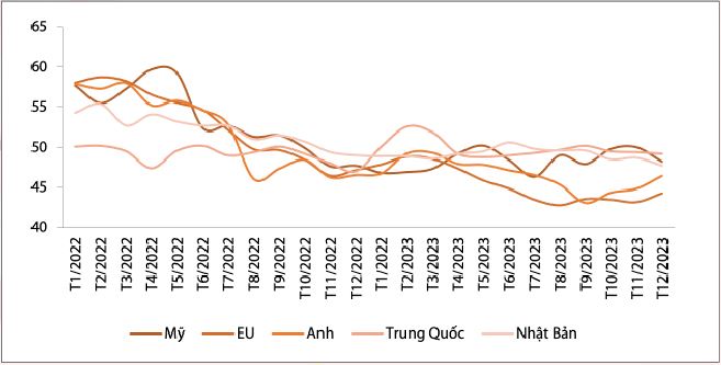 Hình 2: Diễn biến PMI lĩnh vực sản xuất tại các nền kinh tế lớn