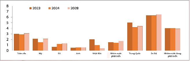 Với lạm phát toàn cầu năm 2023 là 5,9% và từ diễn biến trên, dự báo lạm phát toàn cầu năm 2024 đạt 4 - 5% (thấp hơn mức 7,2% của năm 2022), trong đó vẫn sẽ có khác biệt về chỉ số giá tiêu dùng (CPI) giữa các nước và nhóm nền kinh tế (Hình 5).
