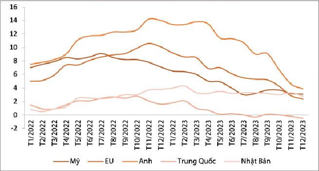 Diễn biến lạm phát toàn cầu đã phần nào bớt căng thẳng, song với mức độ khác nhau tùy từng quốc gia, nhóm nền kinh tế. Tại các nền kinh tế lớn, diễn biến tích cực nhất là Mỹ với mức lạm phát tháng 11/2023 giảm còn 3,1% (đã bám sát hơn mục tiêu 2%), trong khi đó lạm phát tại EU và Anh dù đã giảm song vẫn ở mức cao, chưa thể đáp ứng kì vọng chính sách. Lạm phát của Nhật Bản cũng đã vượt 0,8 điểm phần trăm so với mục tiêu. Trung Quốc là nền kinh tế lớn duy nhất đang phải đối mặt với nguy cơ giảm phát trong bối cảnh kinh tế phục hồi chậm chạp. Tại các nước châu Á, lạm phát được kiểm soát tốt hơn dù nhiều yếu tố tác động còn tiềm ẩn. (Hình 4)