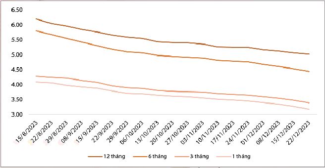 Tại Mỹ: Tại một cuộc họp diễn ra vào tháng 12/2023, Cục Dự trữ Liên bang Mỹ (Fed) một lần nữa tạm ngừng chu kì tăng lãi suất, giữ nguyên lãi suất ở mức 5,25 - 5,5%, đồng thời dự kiến có thể thực hiện một số đợt tăng lãi suất nữa và duy trì lãi suất cao trong thời gian dài. Lạm phát của Mỹ có dấu hiệu hồi phục tích cực, song vẫn chưa thể quay về mục tiêu 2%. Bất chấp CSTT thắt chặt, có một bằng chứng cho thấy Mỹ hiện vẫn đủ sức trụ vững trong chu kì tăng lãi suất là tổng giá trị xây dựng theo tháng của nước này vẫn tăng trưởng dương trong năm 2023. Thị trường đang kì vọng một cuộc “hạ cánh mềm”.