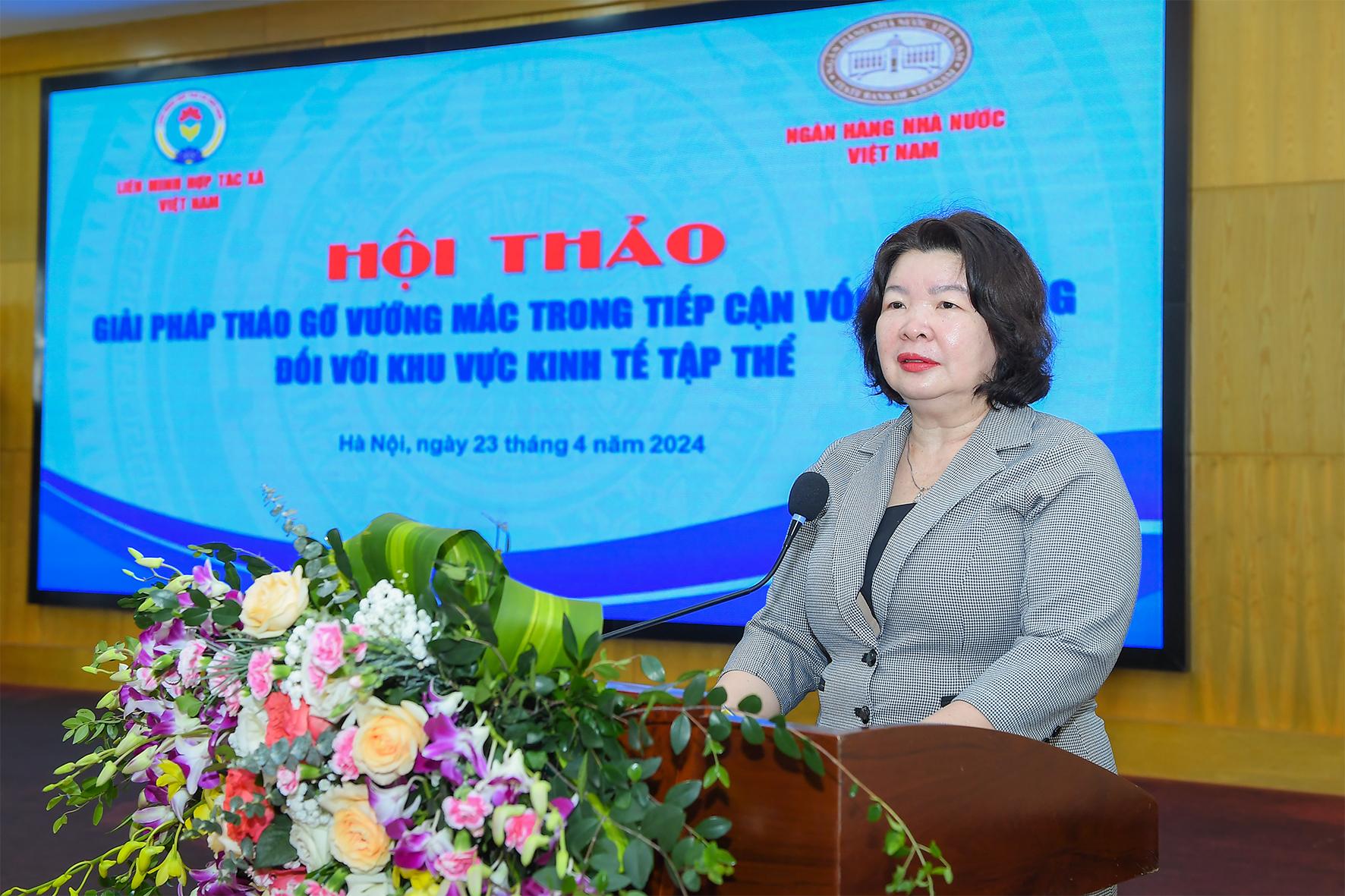Ngày 23/4, tại Hà Nội, Ngân hàng Nhà nước Việt Nam (NHNN) phối hợp với Liên minh Hợp tác xã Việt Nam tổ chức Hội thảo "Giải pháp tháo gỡ vướng mắc trong tiếp cận vốn tín dụng đối với khu vực kinh tế tập thể". Hội thảo do đồng chí Cao Xuân Thu Vân - Bí thư Đảng đoàn, Chủ tịch Liên minh Hợp tác xã Việt Nam (HTXVN), Phó Trưởng ban chỉ đạo Quốc gia về kinh tế tập thể và đồng chí Đào Minh Tú - Phó Thống đốc Thường trực NHNN, Ủy viên Ban chỉ đạo quốc gia về kinh tế tập thể đồng chủ trì.