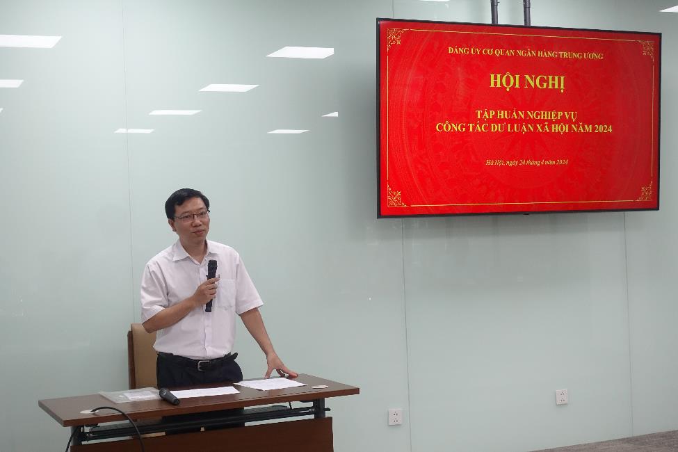 Ngày 24/4, tại Trường Bồi dưỡng cán bộ Ngân hàng Thương mại cổ phần Ngoại thương Việt Nam(Vietcombank), Đảng ủy cơ quan Ngân hàng Trung ương (NHTW) tổ chức Hội nghị tập huấn nghiệp vụ công tác dư luận xã hội (DLXH) năm 2024. Tham dự có đồng chí Lê Thị Mai Hương, Phó Bí thư Thường trực Đảng ủy cơ quan NHTW; Lãnh đạo các ban chuyên trách của Đảng ủy; Các đồng chí cộng tác viên DLXH cấp Đảng ủy cơ quan NHTW nhiệm kỳ 2020 – 2025, Lãnh đạo Trường Bồi dưỡng cán bộ Vietcombank…Báo cáo viên là đồng chí Nguyễn Trường Sơn, Chánh Văn phòng, nguyên Trưởng phòng DLXH, Ban Tuyên giáo Thành ủy Hà Nội.