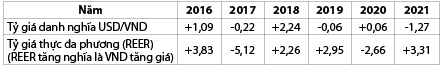 Bảng 1: Tăng/giảm tỷ giá danh nghĩa và tỷ giá thực một số năm gần đây