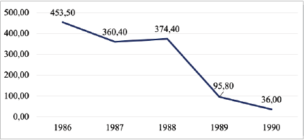 Giai đoạn này được đặc trưng bởi mức lạm phát rất cao, thậm chí ở mức ba con số và là mức cao nhất kể từ năm 1986 cho đến nay. Theo chuỗi thời gian, lạm phát vào năm 1986 đạt 453,50%, năm 1987 đạt 360,40%, năm 1988 đạt 374,40%, sau đó tiếp tục giảm dần và đạt xuống hai con số với mức 36% vào năm 1990 (Ngân hàng Thế giới, 2023). Sau đó, lạm phát gia tăng trở lại lên 81% vào năm 1991, rồi mới giảm dần xuống 8,4% vào năm 1993. Khi xét thành tích chống lạm phát thì việc giảm được từ mức 453,50% năm 1986 xuống 36% năm 1990 đã là một kết quả đáng ghi nhận với mức giảm có thể được hình dung như một đường dốc xuống với độ dốc rất lớn. (Hình 1)