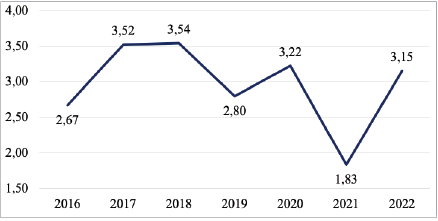 Hình 3: Lạm phát trong giai đoạn 2016 - 2022