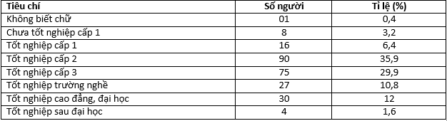 Về trình độ giáo dục: Khách hàng của NHCSXH có đầy đủ trình độ giáo dục từ chỗ không biết chữ đến tốt nghiệp trường nghề, cao đẳng, đại học và sau đại học. Khảo sát 251 khách hàng, cho thấy kết quả như Bảng 1: