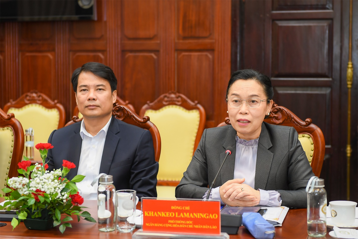 Phó Thống đốc Khankeo chia sẻ với Lãnh đạo NHNN về nhiệm vụ của đoàn công tác lần này và cảm ơn sự quan tâm hỗ trợ của NHNN trong quá trình NHCHDCND Lào xây dựng và sửa đổi các văn bản quy phạm pháp luật những năm qua và đối với đoàn lần này.