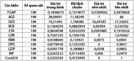 Dữ liệu của nghiên cứu lấy từ 22 NHTM Việt Nam trong giai đoạn 2015 - 2023 phù hợp để đo lường mức độ ảnh hưởng của RRTK. Dữ liệu về yếu tố nội tại ngân hàng được thu thập từ báo cáo tài chính hợp nhất đã được kiểm toán và báo cáo thường niên công bố trên website của các NHTM và tổng hợp từ website Vietstock.vn. Nghiên cứu đã thu được 198 mẫu quan sát gồm 10 biến độc lập; được cho là số quan sát đủ lớn để thực hiện hồi quy và tiến hành các kiểm định trong thống kê. (Bảng 2)