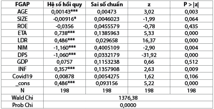 Về quy mô tài sản của ngân hàng, quy mô tài sản có ảnh hưởng ngược chiều với RRTK của các NHTM thể hiện qua tỉ lệ FGAP với mức ý nghĩa 10%. Kết quả này đúng với giả thuyết của nghiên cứu và nghiên cứu của Vodová (2011), Faruque Ahamed (2021), thể hiện các ngân hàng trong mẫu nghiên cứu có sự tăng trưởng tổng tài sản, trong đó, tài sản thanh khoản tăng trưởng nhanh hơn so với tín dụng, đồng nghĩa với việc ngân hàng có khả năng cao hơn để đáp ứng nhu cầu rút tiền của khách hàng, điều này mang lại sự tin cậy cho khách hàng và có thể tạo ra một lợi thế cạnh tranh cho ngân hàng trong việc thu hút nguồn cung. Từ đó, các ngân hàng sẽ có khả năng thanh khoản dồi dào khi đã có sẵn tài sản để dễ dàng xử lý các nhu cầu thanh toán đột xuất hoặc phải sử dụng các nguồn tài trợ bên ngoài. Chính vì thế khi mở rộng quy mô tài sản của ngân hàng sẽ khiến tỉ lệ FGAP giảm xuống.