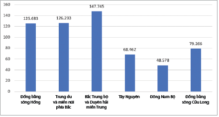 Biểu đồ 2 cho thấy khu vực Bắc Trung Bộ và Duyên hải miền Trung có dư nợ cao nhất 147.745 triệu đồng, chiếm 24,79% tổng dư nợ; khu vực Đồng bằng sông Hồng có dư nợ là 125.683 triệu đồng và Trung du miền núi phía Bắc đạt dư nợ 126.293 triệu đồng, chiếm khoảng 21% tổng dư nợ. Khu vực Đông Nam Bộ có dư nợ thấp nhất, ở mức 48.578 triệu đồng, chỉ chiếm 8,15% trong tổng dư nợ chương trình này. Khu vực Bắc Trung Bộ và Duyên hải miền Trung có mật độ dân số tương đối cao, nhu cầu vay vốn tái hòa nhập xã hội tương đối lớn, đây cũng là khu vực kinh tế còn tồn tại những khó khăn nhất định, phụ thuộc vào các ngành sản xuất nông nghiệp và dịch vụ nhỏ lẻ. Trong khi đó, khu vực Đồng bằng sông Hồng có mức độ đô thị hóa cao, tuy nhiên, nhu cầu vay của các đối tượng cần hỗ trợ vay vốn cũng tương đối lớn, đặc biệt trong các ngành, nghề dịch vụ, sản xuất, kinh doanh nhỏ.
