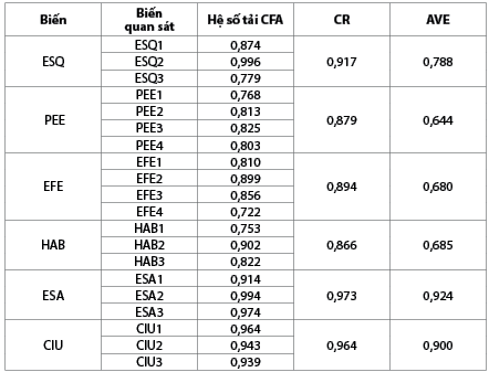 Phân tích CFA cho thấy, các chỉ số CMIN/dF = 1,844 (< 2) và có ý nghĩa thống kê (p-value = 0,000), các chỉ số kiểm định sự phù hợp của mô hình là TLI = 0,942 (> 0,9); CFI = 0,945 (> 0,9); GFI = 0,890 (> 0,8); RMSEA = 0,068 (> 0,08). Theo kết quả phân tích CFA, giá trị của phương sai trích trung bình (AVE) nằm trong khoảng từ 0,644 - 0,924 (> 0,5), độ tin cậy tổng hợp (CR) có giá trị từ 0,866 - 0,973 (> 0,7). Do đó, mô hình phù hợp với dữ liệu thực tế, thang đo đạt giá trị hội tụ (Bảng 2).