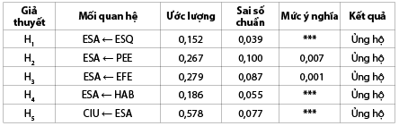 Phân tích CFA cho thấy, mô hình đạt độ phù hợp chung với các chỉ số CMIN/dF = 1,922 (< 2) và có ý nghĩa thống kê (p-value = 0,000), chỉ số TLI = 0,939 (< 0,9); CFI = 0,948 (> 0,9); GFI = 0,872 (> 0,8), chỉ số RMSEA = 0,078 (< 0,8). Kết quả phân tích SEM được thể hiện chi tiết như trong Bảng 4, cho thấy ESQ, PEE, EFE, HAB có tác động tích cực đến sự ESA với các hệ số γ của các giả thuyết H1, H2, H3 và H4 lần lượt là 0,152; 0,267; 0,279; 0,186 (p-value < 0,001), nên các giả thuyết này lần lượt được ủng hộ. Trong đó, EFE là yếu tố mạnh nhất ảnh hưởng đến sự hài lòng trực tuyến so với các yếu tố khác với hệ số γ = 0,279. Đặc biệt, sự hài lòng trực tuyến có tác động rất mạnh đến ý định tiếp tục sử dụng với hệ số rất cao γ = 0,578 (p-value < 0,001), nên giả thuyết H5 được ủng hộ.