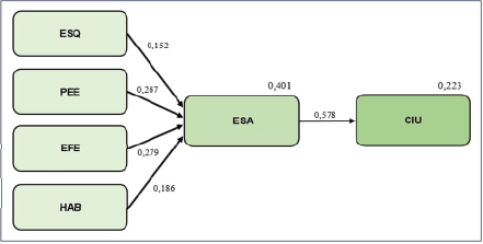 Kết quả phân tích mô hình SEM cũng chỉ ra rằng, các biến độc lập bao gồm ESQ, PEE, EFE, HAB có thể giải thích được khoảng 40,1% (R2 = 0,401) sự biến động của sự hài lòng trực tuyến. Song song đó, thành phần sự hài lòng trực tuyến cũng có thể giải thích được khoảng 22,3% (R2 = 0,223) sự biến động của ý định tiếp tục sử dụng sản phẩm, dịch vụ.