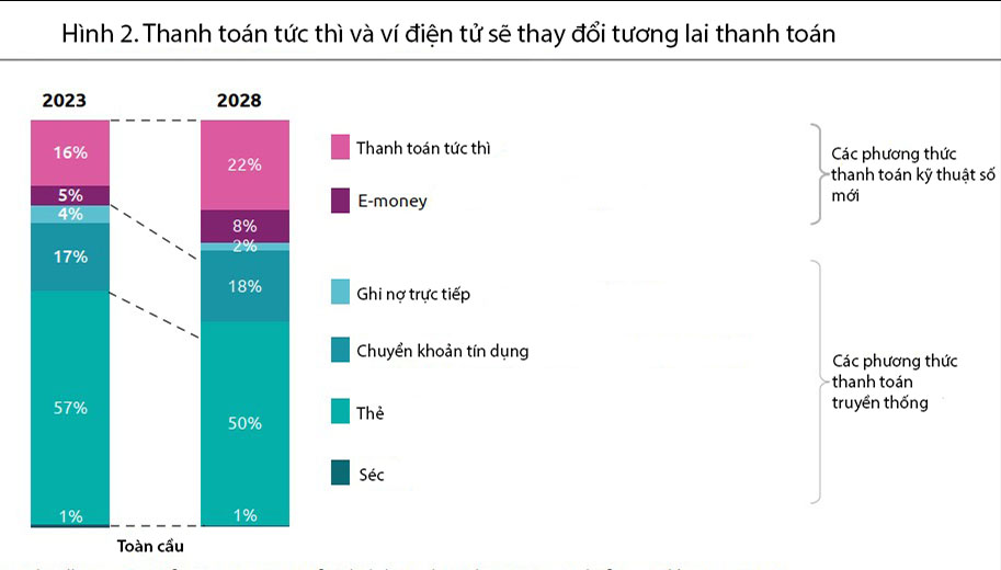 Báo cáo Thanh toán toàn cầu (WPR) năm 2025 của Capgemini cho thấy tỷ lệ thanh toán tức hoặc A2A trong tổng số giao dịch dự kiến sẽ tăng từ 16% vào năm 2023 lên 22% vào năm 2028. Trong khi đó, các giải pháp tiền điện tử, bao gồm ví điện tử, dự kiến sẽ tăng từ 5% lên 8% trong cùng thời gian. Sự tăng trưởng này diễn ra cùng với sự giảm sút của giao dịch thẻ, được dự báo sẽ giảm từ 57% vào năm 2023 xuống 50% vào năm 2028.