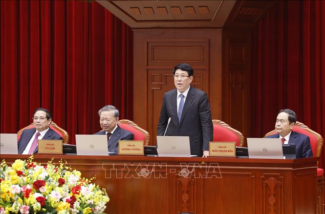 Ủy viên Bộ Chính trị, Chủ tịch nước Lương Cường điều hành Phiên khai mạc Hội nghị lần thứ 11 Ban Chấp hành Trung ương Đảng khóa XIII. Ảnh: TTXVN